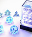Set of 7 Borealis clear polyhedral dice with blue lettering. The basis of these standard-sized Chessex brand dice is clear with Borealis glitter and luminary flecks. Read more..