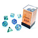 Set of 7 ocean colored (various blues & greens) polyhedral dice with gold lettering. Underscoring is..