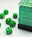 Set of thirty-six 12mm D6 dice. These green six-sided dice are accented with white pips. 12mm is smaller than the standard (16mm) size for dice. Comes in a clear plastic display case.