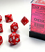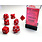 Set of 7 Red polyhedral dice with white lettering. Solid glossy red plastic forms the basis of these standard-sized Chessex brand dice. Underscoring is used to differentiate between the 6 and 9. Seven dice sets are perfect for many role-playing games like Dungeons & Dragons. This dice set comes in a clear plastic display case and contains one of each: