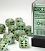 Set of twelve 16mm D6 dice. These swirled green six-sided dice are accented with dark green pips. 16..