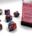 Set of 7 Gemini Blue-Red polyhedral dice with gold lettering. Swirls of pearly blue and red form the basis of these standard-sized Chessex brand dice. Underscoring is used to differentiate between the 6 and 9. Seven dice sets are perfect for many role-playing games like Dungeons & Dragons. This dice set comes in a clear plastic display case and contains one of each: