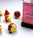 Set of 7 Gemini Red-Yellow polyhedral dice with silver lettering. Swirls of glossy red and yellow form the basis of these standard-sized Chessex brand dice. Underscoring is used to differentiate between the 6 and 9. Seven dice sets are perfect for many role-playing games like Dungeons & Dragons. This dice set comes in a clear plastic display case and contains one of each: