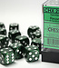 Set of twelve 16mm D6 dice. These green and black speckled six-sided dice are accented with white pi..